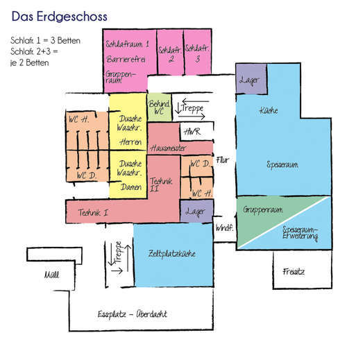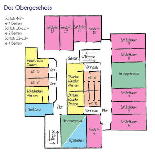 Die beiden Küchen im Jugendhaus sind komplett mit Geschirr, Besteck, Töpfen und Einbauelektrogeräten eingerichtet. Die große Küche verfügt zusätzlich über einen Hockerkocher und eine Spülmaschine. Spülmittel, Tabs für die Spülmaschine, Putzmittel, Putzlappen, Toilettenpapier, Bettwäsche (80 x 80 cm Kopfkissen, Bettlaken, Bettbezug) und Hausschuhe sind mitzubringen. Die Bettwäsche kann alternativ auch für 7,50 €/Satz ausgeliehen werden.